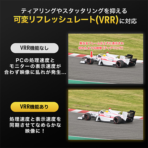 表示機器のリフレッシュレートを動的に変化させることで、画面のカクつきやチラつきをなくし、快適なゲームプレイをサポートします。