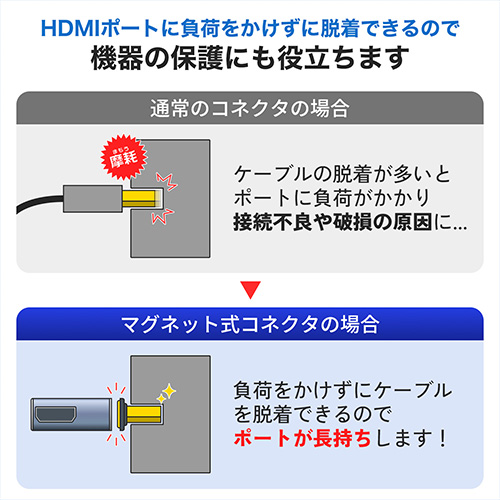 ■ワンタッチでコネクタの脱着が可能HDMIケーブルと本製品を組み合わせることにより機器とケーブルの脱着を磁石の力でスムーズに行えるようになります。