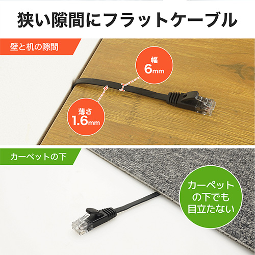 ドアの隙間やカーペット下の配線にも最適な、薄さ約1.6mmのフラットタイプケーブルを採用しています。