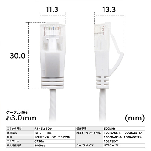 【LANケーブル カテゴリー6A対応 スリムタイプ 3m ホワイト LC30-121SW】