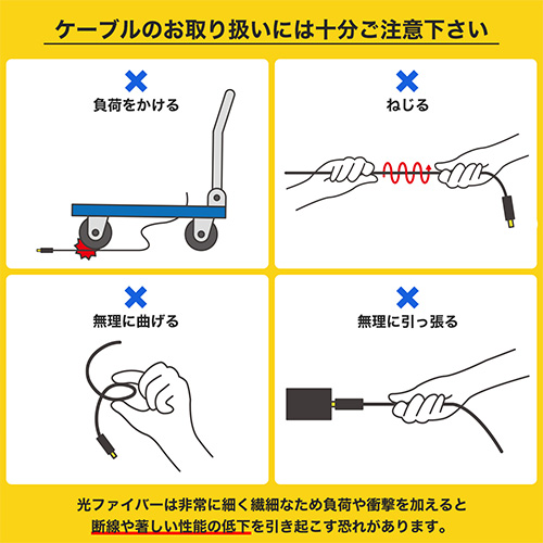 ※ケーブル部分への負荷や衝撃は、断線や著しい性能低下を引き起こす原因となりますので、取り扱いの際は十分にご注意ください。