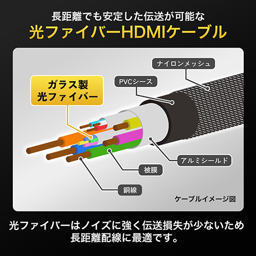■光ファイバー+銅線のハイブリット構造メインの信号線にガラス製光ファイバーを使用したハイブリッドHDMIケーブルです。銅線のみのHDMIケーブルに比べて、伝送損失が少なくノイズの影響を受けにくいため、安定した長距離伝送が可能です。