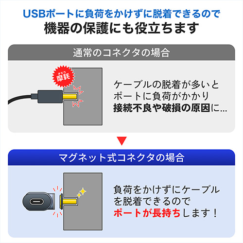 ■ワンタッチでコネクタの脱着が可能USB Type-Cケーブルと本製品を組み合わせることにより機器とケーブルの脱着を磁石の力でスムーズに行えるようになります。