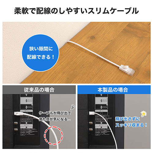狭いスペースでも曲げやすく、隙間配線に適した直径約3mmのスリムケーブルを採用しています。