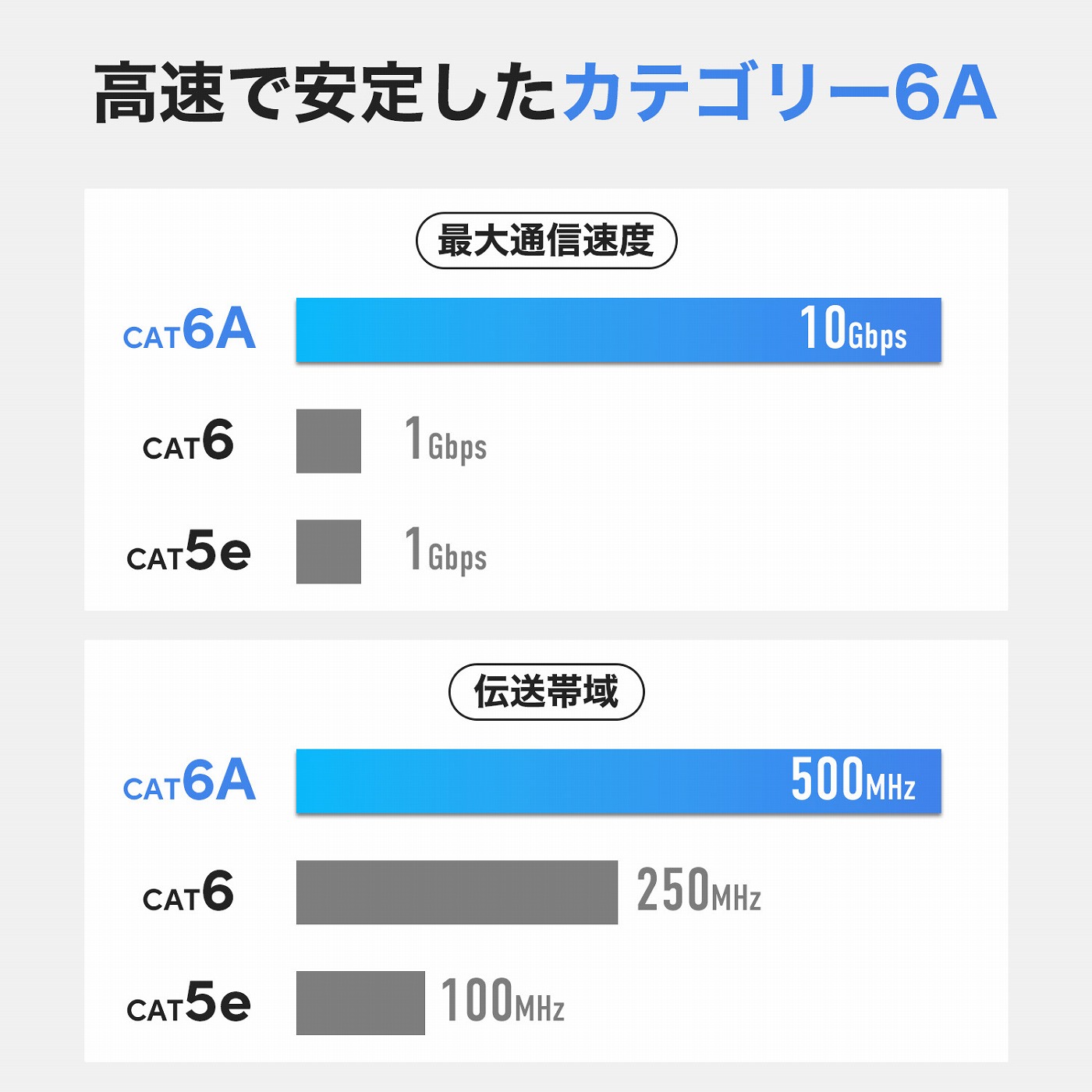 10GBASE-T対応のCAT6Aは最大伝送速度10Gbpsを実現。